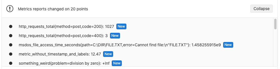 An advanced example of an OpenMetrics text file (from the Prometheus documentation) renders in the merge request widget as: