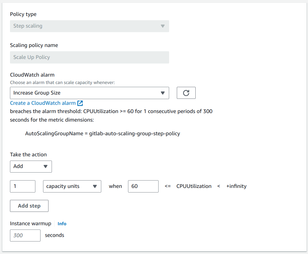 CPUUtilizationfor metrics from EC2 instances By Auto Scaling Group we created earlier. - Create a scale up policy using the following conditions: