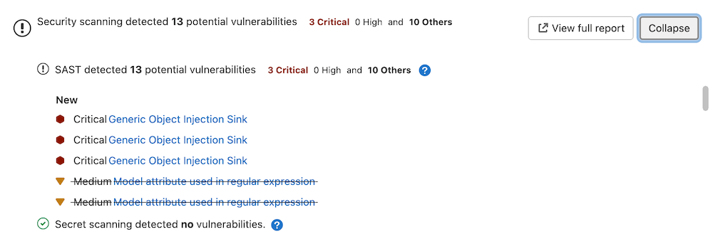 To see all findings on the source branch of the merge request, select View full report to go directly to the Security tab in the latest source branch pipeline.